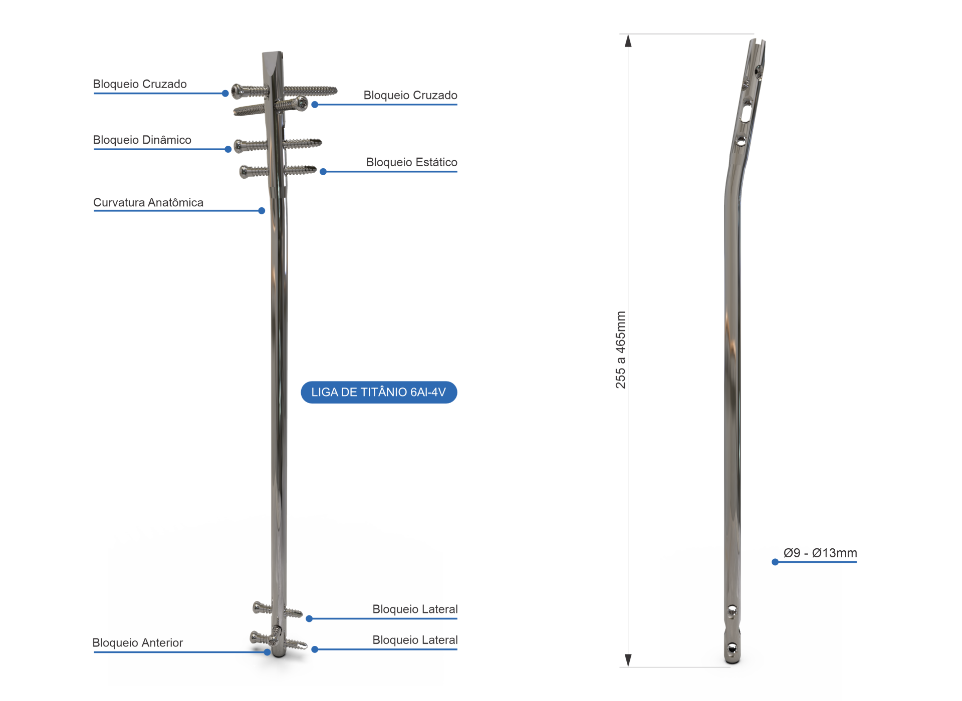 A Haste Intramedular Tibial Cross Lock é um dispositivo médico desenvolvido com o objetivo de promover a estabilização, correção e fixação óssea, porém concebido unicamente para auxiliar a regeneração óssea e não para substituir as estruturas normais do esqueleto humano. Possue corpo cilíndrico e canulado, alongado em forma de tubo, moldado anatômicamente para ser implantado no canal intramedular da tíbia.