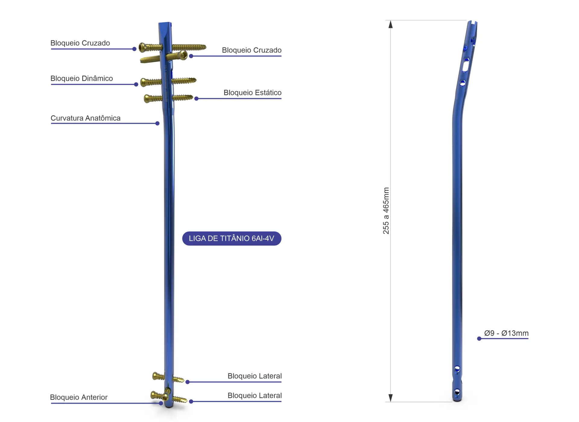 A Haste Intramedular Tibial Cross Lock em Titânio é um dispositivo médico desenvolvido com o objetivo de promover a estabilização, correção e fixação óssea, porém concebido unicamente para auxiliar a regeneração óssea e não para substituir as estruturas normais do esqueleto humano. Possue corpo cilíndrico e canulado, alongado em forma de tubo, moldado anatômicamente para ser implantado no canal intramedular da tíbia.